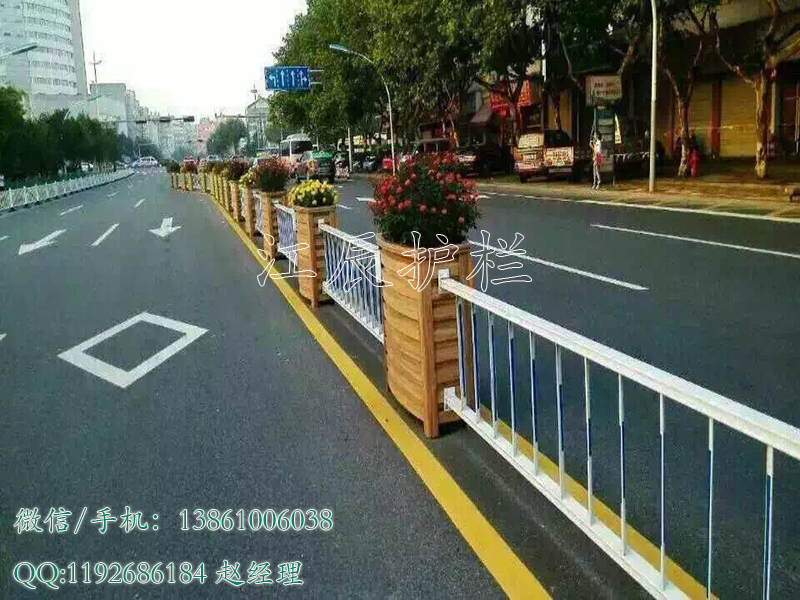 盆景花箱护栏,盆景花和护栏片组合装配,全镀锌钢组合焊接,纯聚酯彩色粉末喷涂。为城市道路减少绿化占地面积,使道路更宽广,同时具有美化城市和交通疏导隔离的双重功能,给过往司机安全的通行又有美的享受改善单一的视觉享受,不会因为长时间的同景带来眼睛疲劳和心境的枯乏,使安全隐患降到萌芽状态。