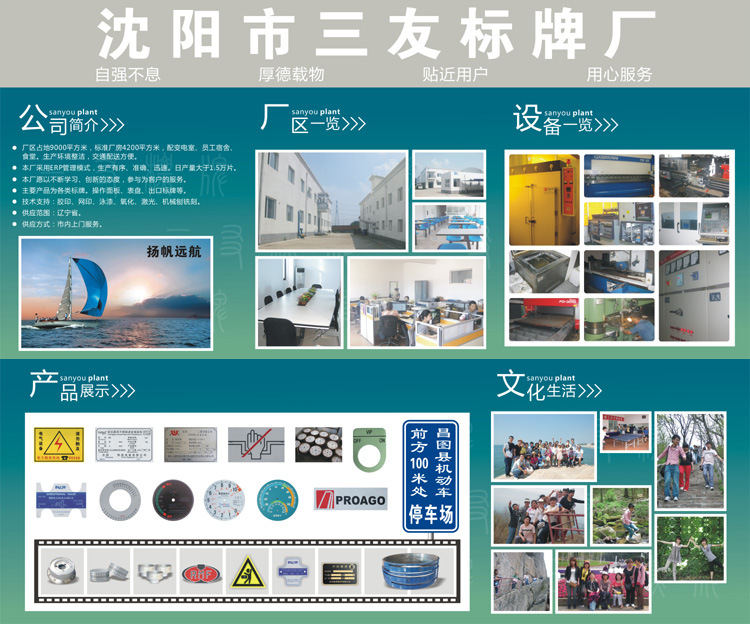 关键字:沈阳标牌制作,沈阳标牌制作,沈阳标牌制作,沈阳标牌制作,沈阳标牌制作,沈阳标牌制作 dbzz 沈阳标牌制作|标牌,顾名思义就是用于制作标识的指示牌的一种制作,上面有文字、图案等内容起到指明方向和警示的作用。常见的标牌有金属平晒标牌、丝印制牌、电铸标牌,铝型材标牌、亚克力标牌、铜字标牌、警示标牌等。 三友标牌是东北地区资深的标牌生产企业,主要产品有各种金属标牌、仪表盘、电力标牌、交通指示牌、安全警示牌、大型标牌、夜光标牌、设备面板、PVC及不干胶标牌等,另有各类异型标牌,对外承揽电泳加工、异型工件、冲压件加工、冷冲模加工、丝网印刷等产品设计制作,产品技术规范严格按照国家标准要求制作生产。 公司不断引进先进生产设备,强化和完善生产管理,唯才是举,任人为贤,重奖科技创新人才,一边不断吸纳国内外先进工艺,推陈出新,力求完美。经过艰苦的十年奋斗、拼搏、改革和创新。公司在沈阳市胡台新城开发区,占地40亩,员工90多人,其中有高级职称5人,中级职称30人,专业的队伍,高科技的设备、以及高水平素质的员工,为三友标牌不断向前发展奠定了基础。我公司一流顶尖的设计团队,可为您量身定制,做到真正的私人订制,做到真正的360度的无死角包装,我们会提前将设计好的模板发送给客户,客户满意,我们开始生产,客户不满意,我们无条件为您重新设计。 沈阳三友标牌厂本着"客户第一,诚信至上"的原则,"您对产品的满意是我最大的满足"为经营理念,积极倡导企业文化,以产品质量为基础,以品种多样求发展,客户的好评是我们无尽的前进动力,以客户为中心,设身处地的考虑客户体验, 三友欢迎各界同仁,企事业单位来我厂参观指导,愿与您携手互利双赢,共同发展! 沈阳市三友标牌厂 总部地址:沈阳市胡台新城振兴二街1-7号 电话:024-87720763 传真:024-87722058 皇姑区分部:黄河南大街38-1号 电话:024-66897312 大东分部:024-66897313 手机:13002429100(陈先生) |