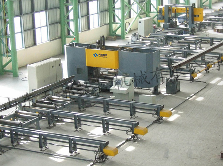 | 关键字:三维钻,数控三维钻,数控型钢三维钻床 dbzz BHD系列高速数控三维钻床 BHD1250/3|BHD1250/3A 机床用途: 机床主要用于H型钢、槽钢、方钢、角钢等工件的钻孔加工,三个钻削主轴箱的定位、进给全部由伺服电机驱动,数控系统控制,数控小车送料,具有高效、高精度的特点,可广泛应用于建筑、桥梁等行业。 产品特点: 1. 床身是由优质钢材焊接而成的框式结构,并通过有限元分析计算在受力较大的地方对方钢管进行了加强处理,焊接完成后进行了热时效处理,这些都很好的提高了床身的静态和动态性,从而保证了整个机床的精度。 2. 每个钻削主轴均采用伺服进给方式,输入钻头的有效长度和被钻工件的厚度,能够自动进行快进—工进—快退的转换。 3. 可实现CAD/CAM直接转换,从而省去了编程和输入的繁琐操作。自动生成加工程序,真正做到了设备的无纸化加工。 4. 机床配置的滚珠丝杠副、直线导轨副、电气件、伺服电机、变频器 等,均为国内外知名厂家供货,开机故障少。 5. 工件采用数控小车送料,伺服送料装置由伺服电机经减速后通过齿轮齿条驱动,编码器反馈,形成全闭环控制,确保钻孔的长度方向的定位精度。钻床进料口装有光电对射开关,作为工件定长基线。 6.本机配备了工件宽度检测和腹板高度检测装置,采用拉绳编码器,结构简单、装配方便,能自动补偿因工件外廓不规整所带来的加工误差,测量稳定可靠。 7.气雾冷却系统(内外冷均配备),自动润滑系统,平板链式自动排屑器。 划线功能说明:首先将划线器安装到主轴快换接头上,通过动力头进给轴(伺服电机进给)将划线器顶到工件腹板或翼板需要划线的位置,移动工件实现工件长度方向的划线,移动动力头实现工件截面方向的划线。 8.机床的动力头主轴采用BT40内冷刚性精密主轴,可使用硬质合金内冷刀具,精度高,效率高。并配备液压打刀缸,装卸刀具极为方便。主轴由大功率主轴电机进行驱动,主轴转速303000r/min,转速范围广。 9.为满足多种孔径的加工,BHD1250/3A型H型钢高速三维钻床配备了3套直列式刀库,每个单元配备一个刀库,每个刀库均配有4把刀具,钻孔过程中3个钻削主轴箱均可自动换刀,可满足多种孔径的需求。 |