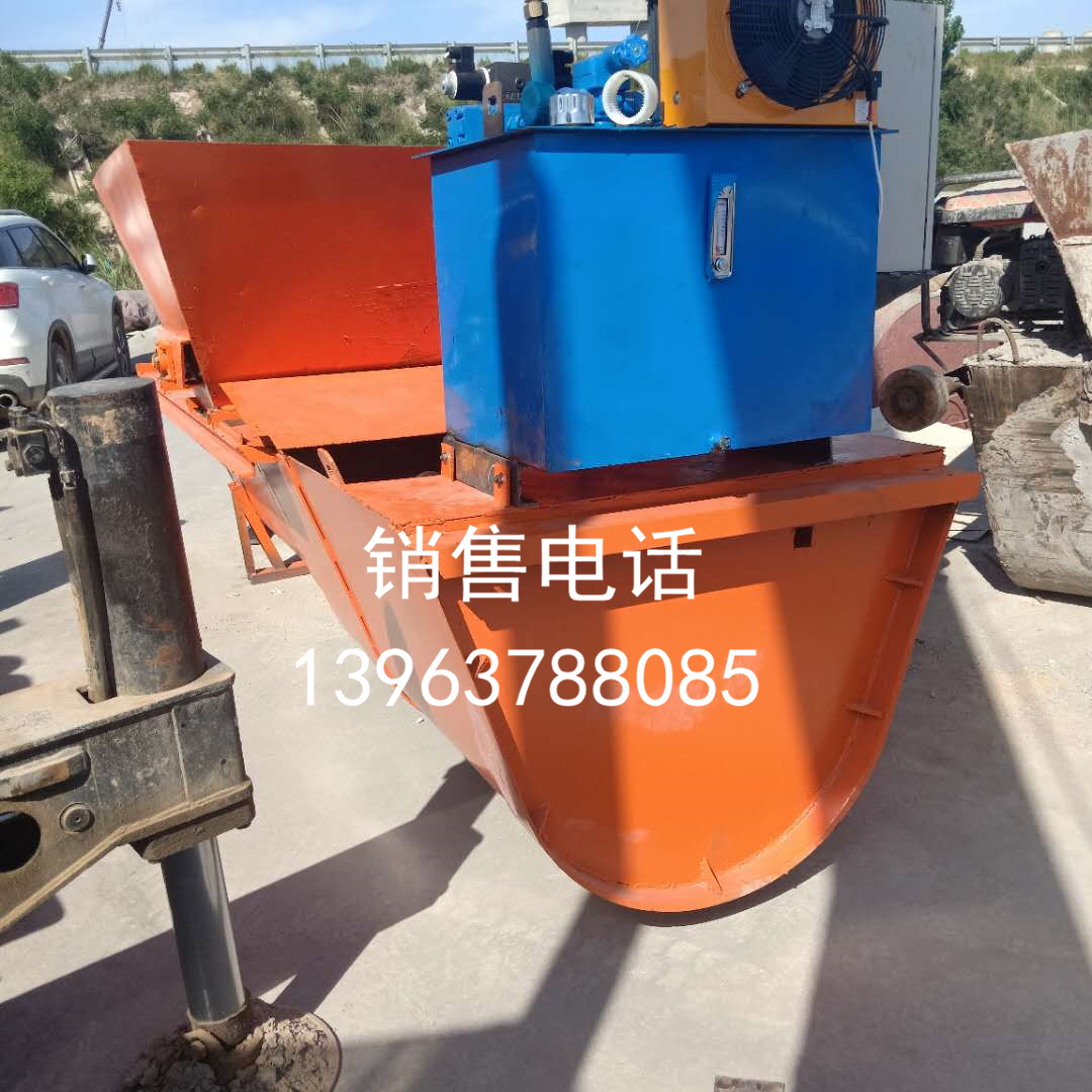 混凝土渠道衬砌机由上料机、摊匀机、抹平机、收面架四部分组成。上料机放置在渠坡上,机架与摊匀机机架连接,架底有行走轮,控制行走。摊匀机、抹平机、收面架平行放置在渠底、中间保持一定距离。