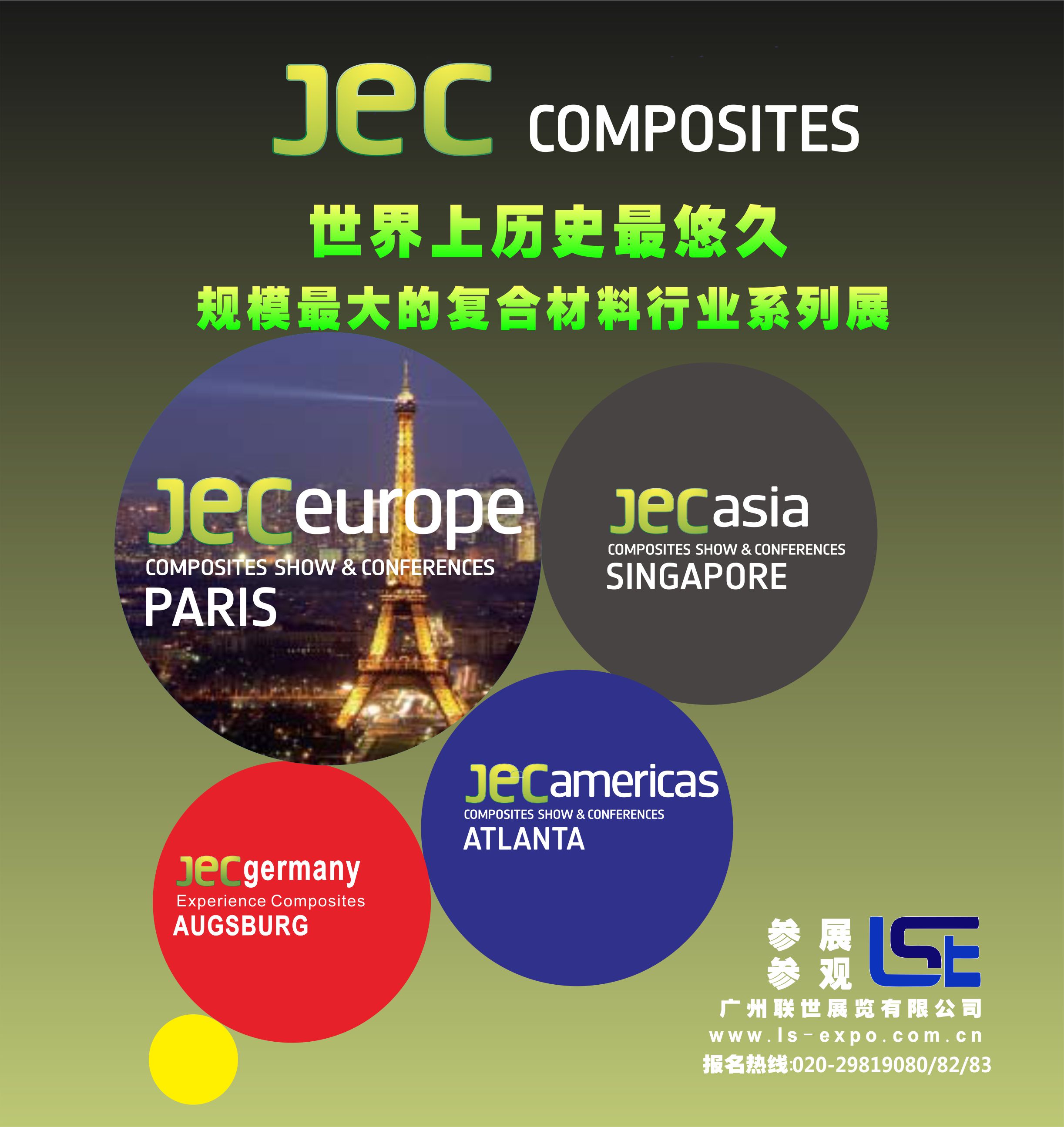 2016年的法国复合材料展有1000余家来自全球的参展商和60000名专业的观众共聚在巴黎的复合材料盛事。在最近的10年中,专业观众数量从近15000人发展到了27000于人增长了86%,其中观众来源最多的国家依次为德国、英国、意大利、比利时、美国、荷兰、西班牙、瑞士、俄罗斯和中国。JEC官方指定代理,拥有JEC大会最优位子,JEC官方指定先进工厂考察,是企业开拓复合材料行业的最佳选择!!