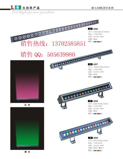 我们供LED洗墙灯 我司是一家集研发、生产、销售为一体的综合性高科技企业,专业生产各种LED系列灯具。我司一直以“提供高品质LED灯具及完善配套服务“予顾客为准则,致力开拓LED供应市场。专营LED灯,LED洗墙灯,LED投光灯,LED投射灯,LED射灯,LED地埋灯。规格:长任意*55*25、长任意*63*62 颜色: 256*256*256,16777216种真色彩 LED光源: 1W高功率LED 长度: 300mm 600mm 1000mm 1200mm LED数量: 9/300mm,18/600mm,27/900mm,36/1000mm,36/1200mm 镜面: 高透光率钢化玻璃 外壳: 铝合金型材 LED洗墙灯使用寿命: 〉=80000小时 控制接口: 户外型超5类网线专用防水接头 输入电源: 350mA恒流 功耗: 9W/18W/27W/36W 使用场所:广告牌、建筑泛光照明、网球场、停车场、体育馆及码头等.