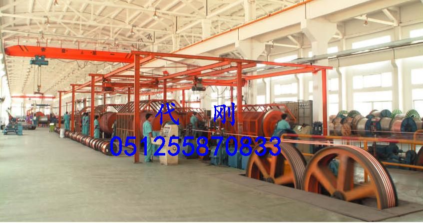 | 关键字:框绞机,绞线机,笼绞机,成缆机,束丝机,铝材 dbzz JCJX-KJ630/12+18型集中上盘框绞线机 本机(带集中上盘装置)主要适用于生产大长度裸铝、裸铜线以及钢芯铝绞线、铝合金导线和扇形导体绞制紧压,圆形导体绞合拉制紧压;该设备主要特点线盘分装在绞笼四周成四等分,集中上盘方便,定位正确可靠,设备刚性、强度高,整体性能好,转动惯量小,运行速度高,该设备采用36级变速牙箱,双主动、双牵引装置,分线轮采用自然分线避免线芯在绞合过程中擦毛,设备放线张力采用气动恒张力控制,确保放线满盘至空盘张力均匀,并设有断线自动停车装置,断线停车直接控制到每个放线盘,当断线线盘停转时主机自动紧停。 一、主要技术参数 1 、绞合单线直径 铜 φ1.5— 铝 φ1.8-- 2、 绞合最大紧压截面 3、绞笼最高转速: 12盘 67156 r.p.m 共六档变速 18盘 57133 r.p.m 共六档变速 4、绞合节距: 38? 5、牵引线速度: 6? 6、主电机功率: 90 KW(DC) 7、框架内放线盘规格: PND 630 8、牵引轮规格: 2×φ 9、收线盘规格: PN1250 ? PN2500 10、设备总重量: 52 t 11、总装机功率; 110 kW 二、设备主要组成部件 1、Ø1600放线装置(端轴式) 壹套 2、12、18盘绞笼体 (带预成型) 共2套 3、12、18盘集中上盘装置 共2套 4、并线模架及紧压架 2套 5、 计米器 1套 6、 主牙箱及36级传动牙箱 1套 7、 2×φ2000牵引装置 1套 8、 φ2500 行走式收排线装置 1套 9、 电控箱及操作台 1套